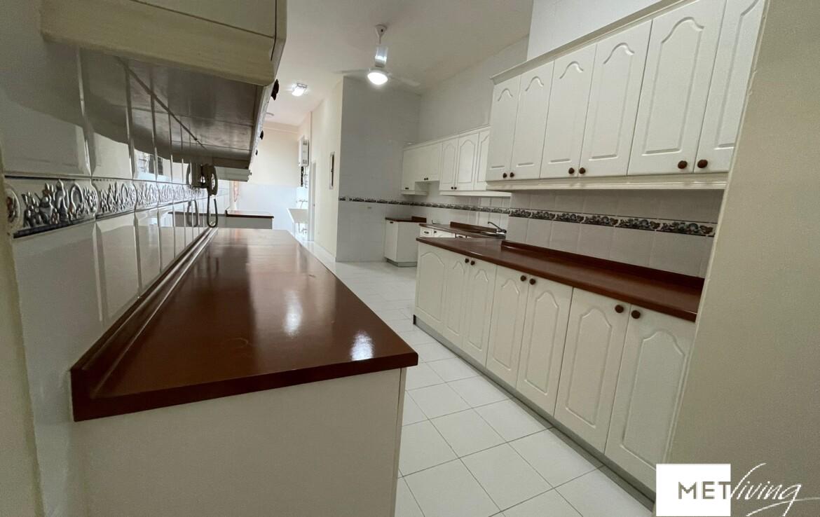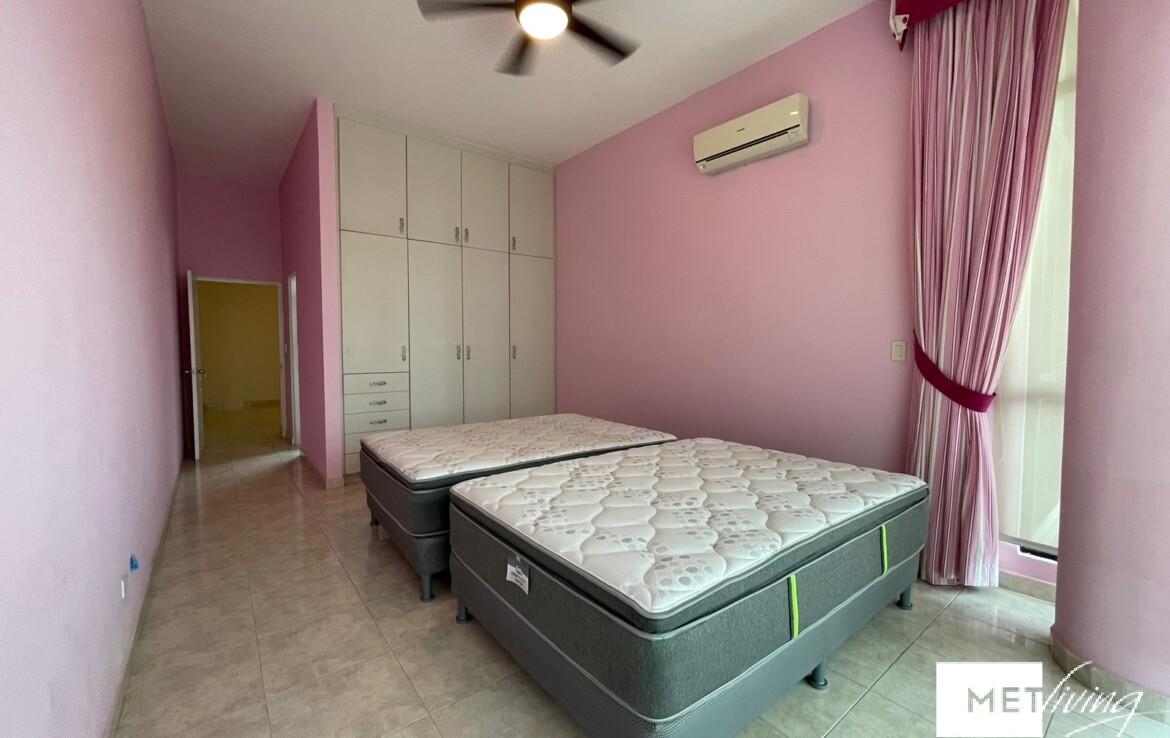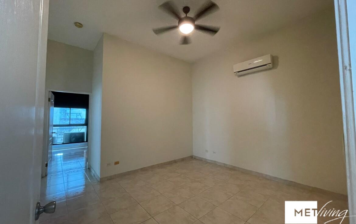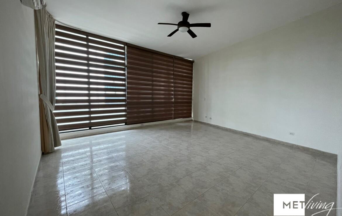 Apartamento de techos altos, con 3 habitaciones, 3 baños, baño de visitas, cuarto y baño de servicio. Cada cuarto con su baño, con aire acondicionado split y abanico. Dos estacionamientos, amplio balcon, family. Amplia sala comedor y cocina. Tiene calentador.